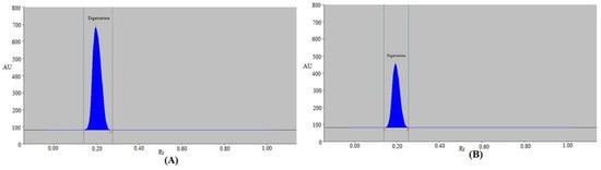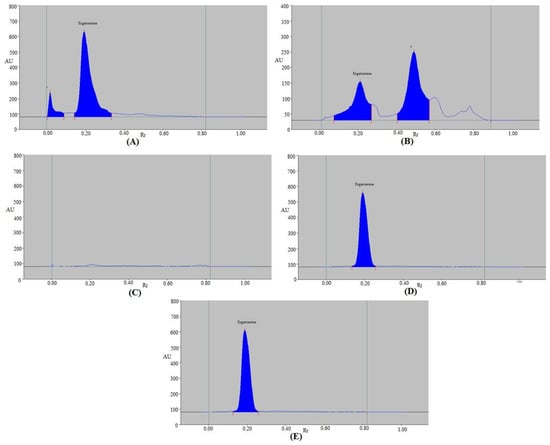 The present technique was used as an alternative to conventional chromatographic assays for the measurement of EGT in commercially available tablets. By comparing the TLC spot at Rf = 0.21 ± 0.01 for EGT with pure EGT using the current assay, the chromatogram of EGT from the commercial tablets was confirmed. EGT in commercially available tablets had the same chromatographic peak as pure EGT when tested with the present technique. Commercial tablets also showed no formulation excipient peaks (Figure 3B), proving that there was no interaction between the tablets’ ingredients and EGT. EGT quantity was calculated using the EGT calibration curve. Using the present technique, the % amount of EGT in marketed formulations was determined to be 99.33 ± 1.04%. The % quantity of EGT in commercial products utilizing the routine HPTLC method was reported as 97–105% [19]. The % content of EGT in marketed formulations utilizing the previously reported eco-friendly HPTLC method was found to be 99.12% [20]. The % assay of EGT in tablet formulations under the USP’s HPLC method was recommended to be 90–110% [44]. The % assay of EGT in tablet formulations using the present HPTLC method was within the USP’s prescribed limit [44]. The % quantity of EGT in commercial products using the present assay was superior to the routine HPTLC method [19], while it was similar to the previously reported eco-friendly HPTLC method [20]. These findings demonstrated that the present assay was appropriate for EGT pharmaceutical analysis.