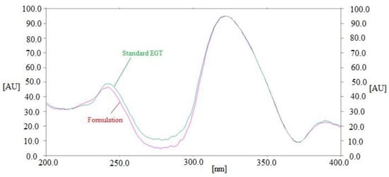 In order to obtain the variety of validation parameters for EGT analysis, the ICH-Q2-R1 criteria were utilized [41]. The system suitability parameters for the present assay are mentioned in Table 2. The present assay’s “Rf, As, and N m−1” for EGT measurement were determined to be 0.27, 1.03, and 5614, respectively, which were suitable for EGT measurement.