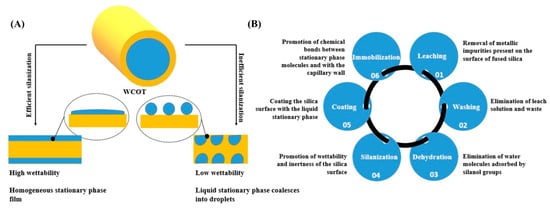 (A) The difference in the silica surface’s coating with the liquid stationary phase depends on the wettability profile; (B) summary of the steps involved in developing WCOT columns and their respective functions.
