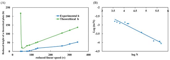 One of the main graphs used to evaluate the performance of a column is the H/uo graph, also known as the Van Deemter curve [22]. This graph allows us to conclude the best linear velocity (uo) for a given column that provides the maximum efficiency (H). In the graph, this best condition is found on the lowest slope of the curve. However, the Van Deemter curve is commonly employed to analyze LC-packed columns. Therefore, the Knox curve should be used to better analyze WCOT-type capillary columns in micro and nanoLC scales. The graph is very similar to Van Deemter’s, with the difference of applying reduced parameters (h/v), which are dimensionless. The form of interpretation is also the same. In Figure 4A, the experimental data of the reduced height of a theoretical plate (h) was plotted as a function of the reduced linear velocity (v). Additionally, in Figure 5A, we can compare the experimental and theoretical curves. The experimental data follow the same trend as the theoretical curve. However, the experimental data do not have a maximum h (as observed in the theoretical curve). This occurs because this region of the graph represents the A term, which characterizes the diffusion of analytes due to multiple paths in a packed column. As open tubular columns have a “hollow interior”, they do not suffer this effect (A term = 0), and therefore, there is no such region in the experimental data. Therefore, from the Knox plot, we can conclude that the best v range is between 50–100, which experimentally corresponds to a mobile phase flow rate between 100–175 nL min−1.