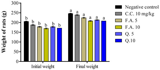 Effect of quercetin and ferulic acid on liver (A,B) and kidney (C,D) parameters. The letters in superscript indicate the significant difference at p < 0.05 between treatments. Negative control (NaCl 0.9%), F.A. (Ferulic Acid), Q. (Quercetin).