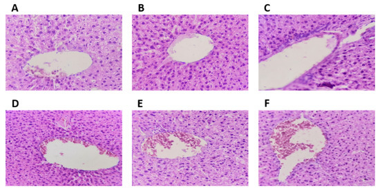 Liver histopathological sections were stained with hematoxylin–eosin–safran at a magnification of ×40: (A) represent the negative control (NaCl 0.9%); (B) represent the reference group treated with clomiphene citrate (10 mg/kg); (C,D) represent ferulic acid groups (5 and 10 mg/kg, respectively); (E,F) represent quercetin groups (5 and 10 mg/kg, respectively).