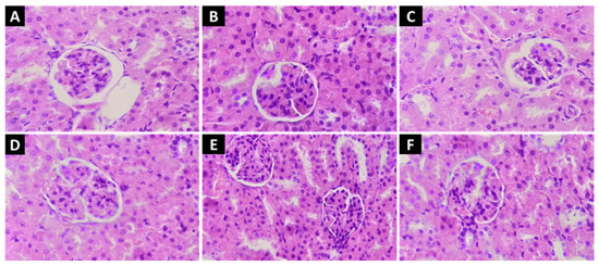 Kidney histopathological sections were stained with hematoxylin–eosin–safran at a magnification of ×40: (A) represents the negative control (NaCl 0.9%); (B) represents reference group treated with clomiphene citrate (10 mg/kg); (C,D) represent ferulic acid groups (5 and 10 mg/kg, respectively); (E,F) represent quercetin groups (5 and 10 mg/kg, respectively).