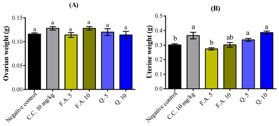Impact of quercetin and ferulic acid on (A) ovarian and (B) uterine weights was assessed in comparison to the negative control (NaCl 0.9%) and positive control (clomiphene citrate (C.C)). The letters in superscript indicate the significant difference at p < 0.05 between treatments. The data represent the mean ± s.e.m. (n = 5). F.A. (ferulic acid), Q. (quercetin).