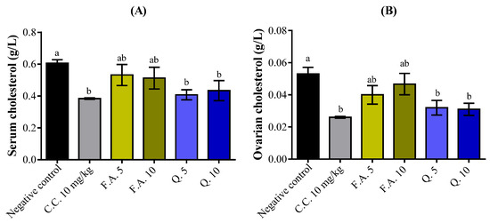The impact of quercetin and ferulic acid on the levels of (A) serum and (B) ovarian cholesterol was assessed. The superscript letters indicate significant differences at a p-value of less than 0.05 among the treatments. The presented data represent the mean ± standard error of the mean (n = 5). Negative control (NaCl 0.9%), C.C. (clomiphene citrate), F.A. (ferulic acid), Q. (quercetin).