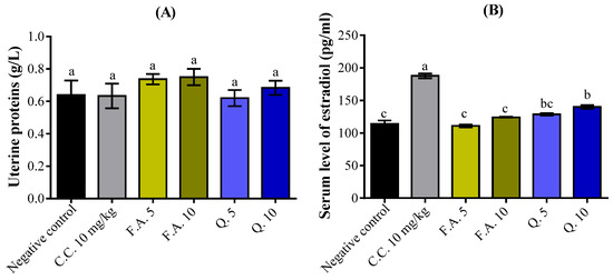 The impact of quercetin and ferulic acid on the levels of uterine proteins (A) and serum estradiol (B) were examined in comparison to the negative control (0.9% NaCl) and positive control (clomiphene citrate (C.C)). The letters in superscript indicate a significant difference at p < 0.05 between treatments. The values represent the mean ± s.e.m. F.A. (ferulic acid), Q. (quercetin).