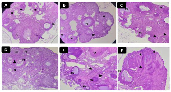 Histopathological sections of rat ovaries: (A) represents the negative control (NaCl 0.9%); (B) represents the reference group treated with clomiphene citrate (10 mg/kg); (C,D) represent ferulic acid groups (5 and 10 mg/kg, respectively); (E,F) represent quercetin groups (5 and 10 mg/kg, respectively). Abbreviations: FP: Primary Follicle; FS: Secondary Follicle; TF: Tertiary Follicle; FG: Graf’s follicle; CJ: Yellow Body; arrowheads: dilated blood vessels.