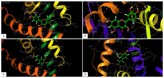 The glide gscore, glide emodel, and glide energy for quercetin in estrogen alpha’s active site were −10.444, −82.345, and −54.171 kcal/mol, respectively. Moreover, quercetin showed in the estrogen beta receptor active site a glide gscore, glide model, and glide energy of −10.662, −74.309, and −51.529 kcal/mol (Table 1).