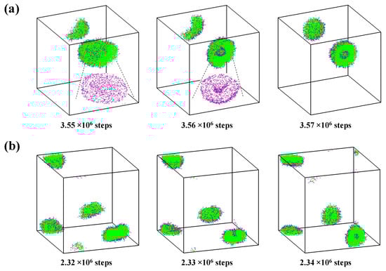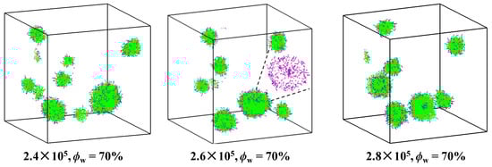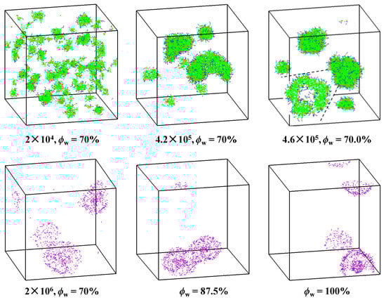 In the case of aWG = 15, the difference between aWG and aAG (aBG) is −10, which means the cosolvent and water is highly attractive. As it is seen in Figure 2a, when the self-assembly starts from = 30%, the randomly dispersed chains gather into many small clusters (the nagg of the largest cluster is 161, the second 90, and others 16~34) after 2 × 106 time steps for equilibrium. With the increase of ϕW, small clusters merge continuously and at ϕW = 36.25%, two big irregular clusters are seen in the simulation box. The section view of the biggest one (seen in the insertion) demonstrates that the hydrophilic and hydrophobic blocks are not segregated. These disordered clusters indicate LLPS [] and are also observed by other simulations [,]. Then a large irregular cluster is formed at ϕW = 37.5%, and the section slide shows several cavities exist in the interior and that the outer hydrophobic membrane has been basically formed. Afterwards, the discrete cavities merge with each other at ϕW = 38.75% and finally, a most matured vesicle is found at ϕW = 40%.