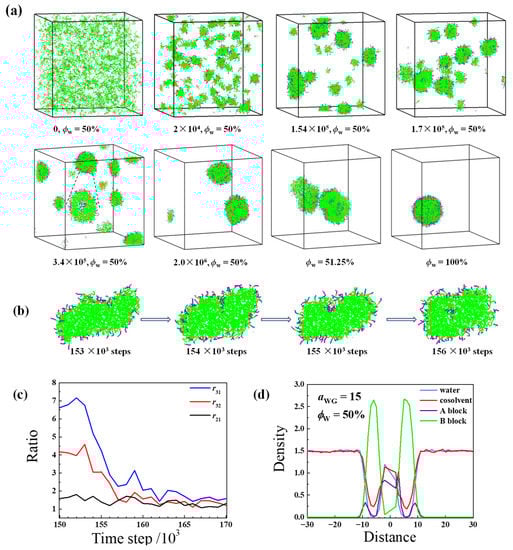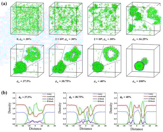 Recently, based on the observation of the phase separation of polymer-rich liquid droplets by time-resolved in situ monitoring technique and the self-consistent mean field (SCF) theory, another mechanism is proposed that the vesicle evolves from the growth and internal phase separation of a polymer-rich liquid droplet precursor in the liquid–liquid phase-separated state []. It is thought that in a liquid mixture with a specific composition of cosolvent (good solvent for all blocks) and water, the polymer-rich liquid droplet (LL) is more thermodynamically favorable than dissolution or self-assembly [,]. Though the LL is also reproduced in simulations [,], as we know, it still lacks the direct observation of how the phase separation within the LL develops into a full vesicular structure by particle simulations. Moreover, most works are concerned about the influences of polymer structures and chemical compositions on the formation and stability of the liquid–liquid phase separation (LLPS) [,], but no research examines the role of the cosolvent during this process.