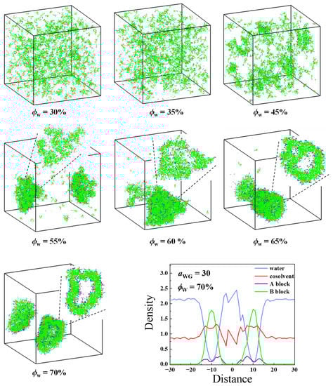 As shown in Figure 5, most chains are free in the solvent mixture at ϕW = 30%. With the increase of ϕW, some small cottony aggregates with nagg = 20~32 are formed at ϕW = 35%. The snapshot and density profile of the largest cluster (nagg = 32) indicate that those small cottony aggregates are LLPS intermediates (Figure S2). These aggregates fuse continuously and at ϕW = 55%, most polymer chains are involved into a big irregular cluster. The section slide of the cluster indicates that the polymer chains are loosely agglomerated and the hydrophilic and hydrophobic blocks are not segregated. Afterwards, phase separation in the cluster takes place gradually, the closed aqueous cavities form and join together, and finally, a most matured vesicle is seen at ϕW = 70%. Therefore, the self-assembly progress starting from = 30% in the case of aWG = 30 is similar to that in the case of aWG = 15, but the evolution from LLPS to vescile occurs later and the LLPS could be observed starting from a broader range. Moreover, lots of cosolvents adsorbed on the vesicle membrane, and the membrane is wide and loose, as demonstrated by the density profile analysis.