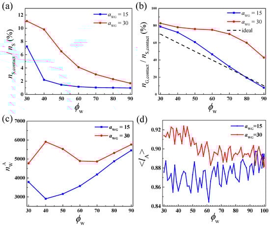 To understand the phys-chemical basis behind the behaviors in the different solvent mixtures, the fractions of solvent beads (both cosolvent and water) which contact with polymers (distance to polymer beads r ≤ 1.0) and the percentages of the cosolvent beads in the contacted solvent beads are shown in Figure 7a,b. Both values are higher in the case of aWG = 30, which indicates that the cosolvent is preferentially adsorbed in the polymer phase when the cosolvent and water are weakly repulsive. The high cosolvent content in the clusters would weaken the repulsion interactions of aAB and aBW. Therefore, when aWG is higher, there are more free chains in the system, the LLPS could be observed starting from a broader range, and the formed clusters swell highly. Moreover, in the case of aWG = 15, the percentage of cosolvent in the contacted solvents is higher than the average ϕG (= 1 − ϕW) if ϕW < 80%, which means that the cosolvent is also slightly enriched in the polymer phase even in a strongly attractive liquid mixture.
