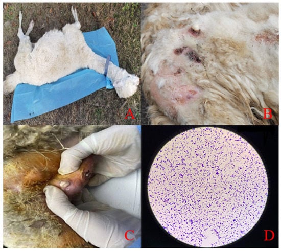 (A) The general photo of the clinical case of a llama. (B) Superficial abscesses. (C) White thick juice was observed by squeezing the abscess site. (D) Isolated strain, Gram stain, 40×.