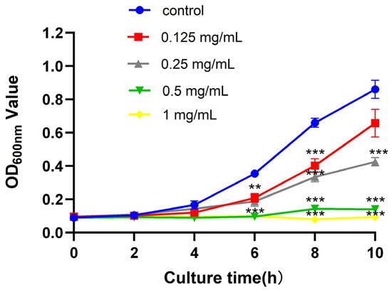 Growth curves of S. agalactiae lactis under the action of different concentrations of nano-zinc oxide. Error bars refer to the SD of 3 replicates of each assay (** p < 0.01, *** p < 0.001).
