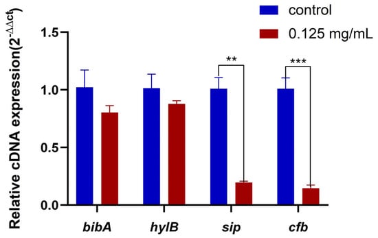 When the concentration of the ZnO QDs was 0.125 mg/mL (1/4 MIC), the expression levels of sip and cfb were significantly inhibited (Figure 3). Although there was no significant difference between the hylB and bibA genes, the transcription levels were reduced by 21.4% and 13.5%, respectively, compared to those of the control group.