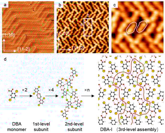 DBA molecules were self-assembled into a multilevel network structure, namely DBA-I, on a pristine Au(111) surface held at room temperature (RT)—see the STM overview in Figure 1a. The high-resolution STM topographic image (Figure 1b) depicts the unit cell with parameters: a = 3.29 nm, b = 1.45 nm and θ = 90°; the vector a is in alignment with the substrate vectors <1−10>. The individual molecule has two bright terminals representing Br atoms, while the carboxylic group appears in a lateral protrusion close to one of the Br terminals. Thus, each DBA is presented in an asymmetric shape; see the two outlined molecules in Figure 1c. Due to the relatively low catalytic activity of the Au(111) surface [32], DBA presumably maintained intact at this experimental condition. Accordingly, we have proposed a tentative structural model for DBA-I, where a three-level assembly scheme is presented; see Figure 1d. The first level of the assembly includes the formation of molecular dimers, where each two DBA monomers are interconnected through the two carboxylic groups. The resulting O-H⋯O distance in the dimeric unit measures 2.7 Å, falling in the range of the typical cyclic hydrogen bond [13,16]. The DBA dimers, with two different prochiral configurations, constitute the first-level subunits. Towards the second-level assembly, the four dimers are interconnected mainly through complementary Br⋯H-C hydrogen bonds (green dotted lines), measuring a Br⋯H distance of 2.5–3.1 Å [19,20,22]. Our tentative model also suggests Br⋯Br (red dotted lines) and O⋯H (black dotted lines) bonds joining the second-level subunit (see the summary of complementary bonding motifs in Table S1 in Supporting Information (SI)). Finally, these second-level subunits (i.e., the aggregates of four dimers) are further interconnected mainly by the outmost Br terminals, which constitute complementary bonding motifs, including Br⋯H-C, Br⋯Br, Br⋯O (blue dotted lines) and O⋯H (black dotted lines). The resulting extended two-dimensional supramolecular assembly constitutes the third-level superstructure. In short, the COOH⋯COOH, Br⋯H-C (or O⋯H) and Br⋯Br bonding motifs coexist on surface, which, however, emerge in different structural subunits and afford a three-level supramolecular assembly. Note that we have assigned the dimeric unit assisted by COOH⋯COOH as the first-level subunit, because the bonding motif is of high directionality and orthogonality, and solely emerges in dimeric units. Distinct from COOH⋯COOH, the configuration of Br⋯Br, O⋯H and Br⋯H-C bonding is highly adaptable, and thus they are assigned as complementary bonding motifs in the high-level assemblies.