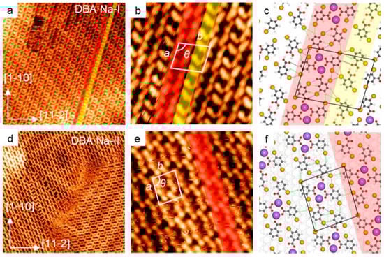 By customizing the configuration of the first-level subunit, one can design an alternative multilevel superstructure. To this end, we have co-deposited DBA and NaCl onto a Au(111) substrate held at RT, aiming to investigate the effect of alkali coordination in the assembly. An STM overview (Figure 2a) reveals a new structure (namely, DBA·Na-I) consisting of two types of rows; see the yellow (row-I) and red (row-II) shaded ribbons. Both rows propagate along the direction at ±14° from substrate vectors <11−2>. The high-resolution STM image (Figure 2b) reveals the unit cell with the parameters: a = 2.18 nm, b = 1.77 nm and θ = 97°. As shown in the tentative structural model (Figure 2c), in row-I are the DBA dimeric subunits from the two intact DBA molecules paired by cyclic COOH⋯COOH H-bonds with the measured bond length of 2.7 Å, which resembles that for DBA-I. We noted that no protrusions representing Na atoms were resolved in our STM observation. Nevertheless, considering that the structure only emerged after the co-deposition of NaCl, we have proposed that Na atoms exist in DBA·Na-I, particularly in row-II. Previous reports documented that Na was invisible in STM images, presumably because of its electronic state [26,28,30]. In addition, we propose that the four DBAs are deprotonated because of the bonding with Na [25,33]. In row-II, the two Na atoms 4.4 Å apart are embraced by four adjacent DBA molecules. The surrounding O atoms are about 2.2–2.3 Å away from the Na atom. This structural model is also supported by our DFT simulation (vide infra). The 4DBA-2Na unit forms a subunit directed mainly by Na⋯COO ionic bonding motifs. In addition, two Br⋯Br bonds (red dotted lines) assist the stabilization of a subunit. Note that the charges of alkali ions and carboxylate groups are ignored, since the substrate may partially screen the adsorbates charges. In between these subunits, the Br⋯H-C and Br⋯O bonding motifs (green and blue dotted lines) assist in constituting row-II. Finally, the two types of rows are mainly connected to each other by Br⋯Br and Br⋯H-C bonds (see the red and green dotted lines).