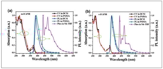 | o-ICzPBI | 267, 290, 371 | 382/383 | 3.35 | 2.83 | −5.68/−2.18/3.50 | −6.06 | 3.25 |