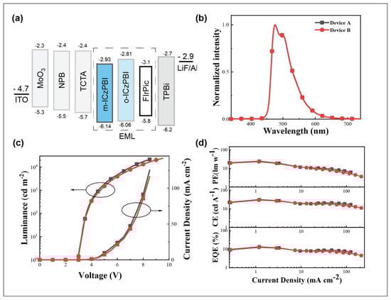 - Maheshwaran, A.; Sree, V.G.; Park, H.-Y.; Kim, H.; Han, S.H.; Lee, J.Y.; Jin, S.-H. High Efficiency Deep-Blue Phosphorescent Organic Light-Emitting Diodes with CIE x, y (<= 0.15) and Low Efficiency Roll-Off by Employing a High Triplet Energy Bipolar Host Material. Adv. Funct. Mater. 2018, 28, 1802945. [Google Scholar]
