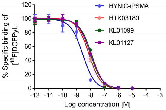 Inhibition of [18F]DCFPyL binding to PSMA-expressing LNCaP cells by various concentrations of HYNIC-iPSMA, HTK03180, KL01099, and KL01127.