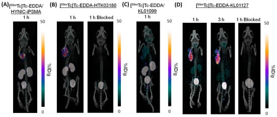 In vivo stability studies were conducted for all of the investigated tracers, and mouse plasma and urine samples (n = 3) were collected at 15 min post-injection for radio-HPLC analysis to check their intact fractions (Figures S5–S8). The intact fractions in urine and plasma samples were comparable for both [99mTc]Tc-EDDA-HTK03180 (84.2 ± 5.9% vs. 82.2 ± 0.5%, Figure S6) and [99mTc]Tc-EDDA-KL01099 (67.3 ± 26.7% vs. 72.9 ± 5.6%, Figure S7). However, a higher intact fraction in urine samples than in plasma samples was observed for both [99mTc]Tc-EDDA/HYNIC-iPSMA (87.2 ± 3.1% vs. 14.9 ± 3.8%, Figure S5) and [99mTc]Tc-EDDA-KL01127 (84.7 ± 8.5% vs. 32.1 ± 6.6%, Figure S8).
