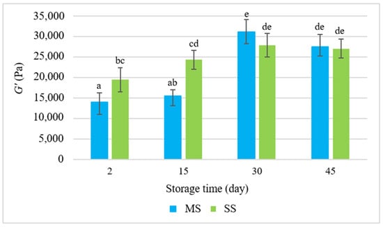 The elasticity modulus (G′) during the storage of the salami sausages. a–e = the mean values with the same superscript are not significantly different (p < 0.05; mean ± SD; n = 6; MS—mould salami, SS—smoked salami).
