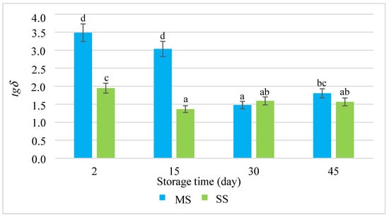 The loss tangent (tgδ) during the storage of the salami sausages. a–d = the mean values with the same superscript are not significantly different (p < 0.05; mean ± SD; n = 6; MS—mould salami, SS—smoked salami).