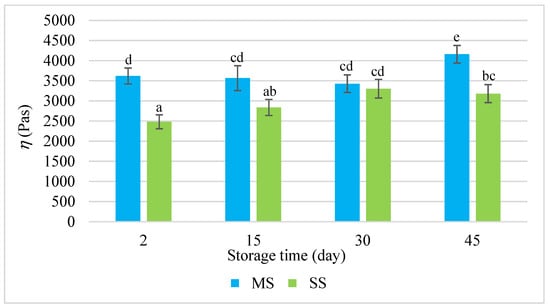 The dynamic viscosity (η) during the storage of the salami sausages. a–e = the mean values with the same superscript are not significantly different (p < 0.05; mean ± SD; n = 6; MS—mould salami, SS—smoked salami).
