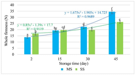 Changes in the textural properties of the whole salami bar vs. the storage time. a–f = the mean values with the same superscript are not significantly different (p < 0.05; mean ± SD; n = 12; MS—mould salami, SS—smoked salami).