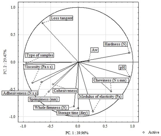 Two principal components were identified from the correlation matrix. They explained 69.43% of the total variability (PC1—39.96% of variability, PC2—29.47% of variability). The correlations with the input variables are shown in Figure 5. The graph shows the results of the correlation-based principal component analysis (PCA) for two types of salami samples (SS and MS) stored for 45 days. The PCA was based on all results: pH, water activity, whole firmness (N), hardness (N), adhesiveness (N × s), springiness (mm), cohesiveness, chewiness (N × mm), modulus of elasticity (Pa), loss tangent, and viscosity (Pa × s). The values of viscosity (Pa × s), adhesiveness (N × s), springiness (mm), and cohesiveness formed separate clusters, thus indicating a positive correlation with the type of sample but a negative correlation with the values of the water activity and hardness (N). The values of the loss tangent were negatively correlated with the storage time, modulus of elasticity (Pa), chewiness (N × nm), and pH.
