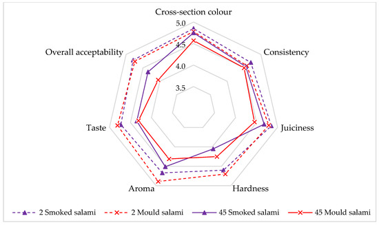As shown in Figure 6, most of the sensory characteristics were very similar to each other, especially on the second day of storage. The difference reached 0.1–0.2 points. None of the differences observed in the sensory evaluation was statistically significant (p > 0.05). Smoked salami was rated the highest in terms of cross-section colour (4.9) and juiciness (4.9). In the case of mould salami, the aroma was shown to be the highest-rated characteristic (4.9). Mould on the surface of the salami bar gives it a delicate taste and a characteristic smell. On the 45th day of storage, the salamis were rated slightly lower for their all sensory characteristics than on the second day of storage. The biggest, though statistically insignificant, changes were noticed in terms of hardness, taste, and overall perception regarding the smoked salami (p > 0.05). The difference reached 0.4 points. In addition, the instrumental analysis of the texture revealed greater hardness of the smoked salami. Higher values of these parameters affect the sensory evaluation of the texture. In the case of the mould salami, the largest decrease was found for aroma and taste at a level of 0.5 points. It was probably related to the excessive metabolic activity of the fungi during storage (excessive mould odour and odd odour) [38]. For all other sensory characteristics between samples, the differences were on the level of 0.2–0.3 points. Additionally, the overall acceptability of mould salami after 45 days of storage was rated the lowest. This was due to the deterioration of the colour of the salami surface from white to grey.