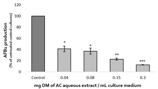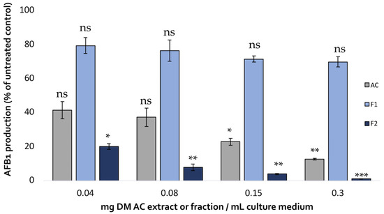 The impact of the two fractions on AFB1 production in A. flavus compared with that of the initial aqueous extract is shown in Figure 5.