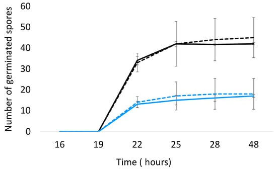 Germination of A. flavus NRRL 62,477 spores in the presence (dotted lines) or absence (solid lines) of A. citrodora aqueous extract at 0.3 mg DM/mL culture medium. The initial theorical number of spores inoculated onto culture medium was 50 (black) and 25 (blue).