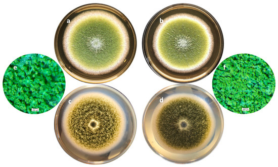 Macroscopic aspects of an A. flavus culture after 7 days of incubation at 27 °C in the absence (a,c,e) or presence (b,d,f) of 0.3 mg DM/mL culture medium of A. citrodora extract. (a,b) show the aspect of the colonies under standard lighting; (c,d) show the aspect of the colonies when lighting under the Petri dish, illustrating the compaction of the basal mycelium in treated culture (d). (e,f) are magnification (×30) of cultures showing the increased spore density in treated culture (f) compared with control one (e).
