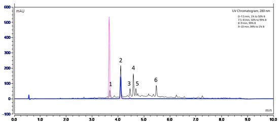 UV chromatogram obtained by high-performance liquid chromatography UV diode-array detection (HPLC-DAD) at 280 nm for Fraction 2 of A. citrodora at a concentration of 2 g DM/L (black) and those of commercial standards of luteolin-7-diglucuronide (blue) and caffeic acid (pink). The mobile phase consisted in solvent A (H2O−HCOOH, 999:1, v/v) and B (CH3CN−HCOOH, 999:1, v/v) and a flow rate of 0.55 mL/min. The identification of compounds corresponding to peaks numbered 1 to 6 are listed in Table 3.