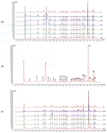 As is known, the content of an active ingredient cannot represent the overall quality of a sample. Moreover, a single active substance is not responsible for the overall pharmacological potency. Therefore, in order to comprehensively evaluate the quality of CR from different sources, we simultaneously analyzed the peak area changes in several different metabolites as quantitative expressions. Figure 9A reveals the distribution of each peak in CR from different origins. Comprehensively, the contents were significantly high in the WD samples, followed by PS, WY and GZ, and the content was the lowest in WS and WN. This indicated that the quality of CR in Gansu and Shanxi Province was the best, followed by that in Sichuan Province, while that in Guizhou Province was relatively poor. These results demonstrated a large difference in the accumulations of 13 marker compounds (peaks 13, 5, 6, 10, 26, 21, 16, 20, 23, 22, 14, 19, 8) in different origins. We also analyzed the 16 marker compounds (peaks 22, 27, 19, 7, 12, 21, 5, 26, 9, 4, 1, 28, 8, 6, 24, 17) in CR from different storage time and kneading processing (Figure 9B). The contents of the 16 marker compounds were extremely high in K0Y samples, indicating that CR was of good quality after kneading. Simultaneously, by comparing the peak area of 16 marker compounds of CR with different storage times, it was obvious that the longer the storage time, the worse the quality of CR. The best-quality CR is a fresh one, that is, CR stored for 0 years. Therefore, we could assess the quality of CR by analyzing the characteristic peaks of the fingerprint.