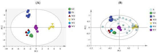 These findings showed that the metabolites in the samples of different origins, storage time and kneading processing varied significantly. The results of the cluster analysis showed that the metabolite compositions were somewhat influenced by the origins, storage duration, and kneading procedure. The accurate classification of the CR samples was one of the goals of this study. As could be seen, the dendrogram-estimated categorization trend of the samples showed significant discrimination between different samples and decent clustering within the same samples. However, HCA displayed a few drawbacks, including poor visualization and the inability to select out variables that were not related to the categorical variates. Therefore, other multivariate statistical analyses need to be applied in order to further distinguish the samples.