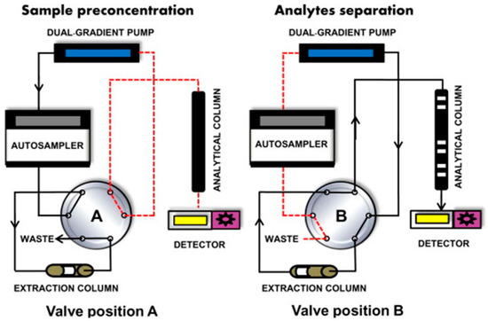 General scheme of a column switching (online IT-SPME) liquid chromatography approach. Valve position A represents the extraction procedure, and valve position B represents the elution and separation procedure. Reproduced with permission from TrAC Trends Anal. Chem., 62, Fernández-Ramos, C.; Šatínský, D.; Šmídová, B.; Solich, P., Analysis of Trace Organic Compounds in Environmental, Food and Biological Matrices Using Large-Volume Sample Injection in Column-Switching Liquid Chromatography, Pages 69–85, Copyright (2014), Elsevier [63].