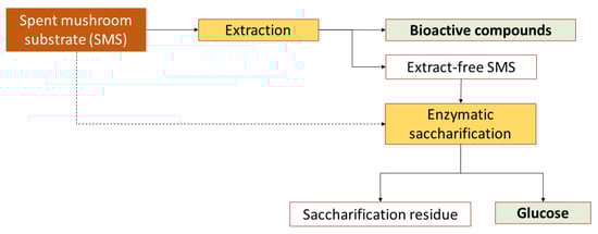 Schematic layout of the experimental procedure followed for the extraction of bioactive compounds from SMS and enzymatic saccharification of the cellulose contained in the extract-free SMS.