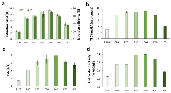 The highest antioxidant activity (0.4 mM GAE) was found in the extract from the E40 solvent mixture (Figure 2d). The lowest value (0.1 mM GAE) was observed when ethanol was the only solvent (E100). Antioxidant activity correlated well with the concentration of total phenolics in the extracts (see Section 3.5).
