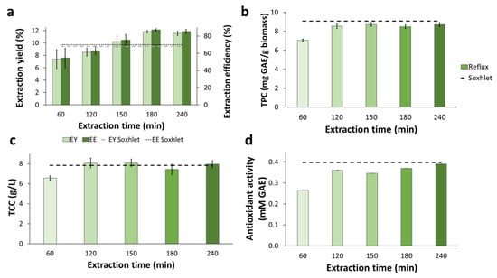 Reflux extraction applied to BPKO SMS lasted between 60 and 240 min, and it was performed with the E40 solvent system, which gave the best results in the Soxhlet experiment (see Section 2.2.1). The extraction yield and efficiency increased proportionally with the reflux time for the first three hours (Figure 3a). After that, a plateau was reached. Reflux lasting 150 min or longer resulted in higher EY and EE than Soxhlet extractions. For facilitating the comparison, horizontal lines denoting the best results achieved by Soxhlet extraction are included in Figure 3.
