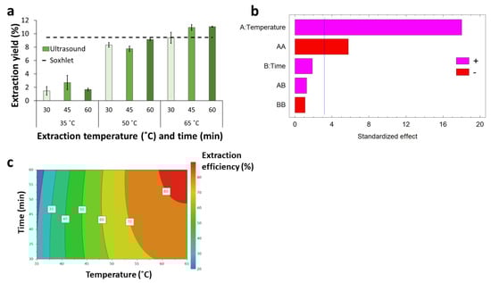 The response contour plot provides a better description of the estimated effect of the temperature on the extraction efficiency (Figure 4c). The graph shows that the EE increased sharply with temperature increase from 35 °C to around 50 °C. In contrast, further temperature increases exerted a relatively moderate effect. A region with maximal EE can be reached at around 60–65 °C and extraction times above 50 min.