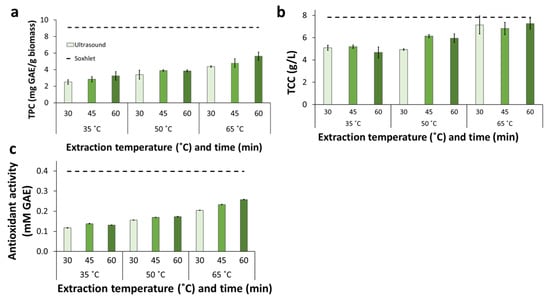 The antioxidant activity of UAE extracts increased with temperature (Figure 5c). For experiments at 35 and 50 °C, the results were somewhat comparable for different extraction times at a given temperature except for extractions at 65 °C, which showed a general increase with extraction time. In addition, even for the extract from UAE at 65 °C and for 60 min, the antioxidant activity was lower than for Soxhlet and reflux extractions.