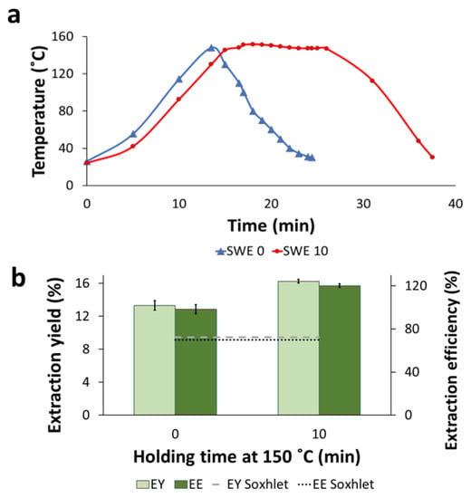 Subcritical-water extraction applied to BPKO SMS. Temperature profiles (a), extraction yield, and extraction efficiency (b). The extraction was held with either 0 or 10 min holding at 150 °C. Mean values from triplicate experiments were used to build the graph in panel (b). The error bars show the standard deviations.