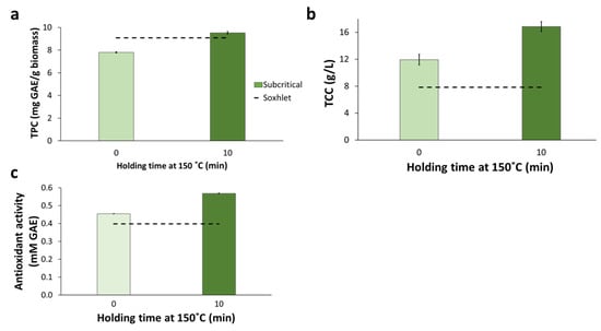 Subcritical-water extraction applied to BPKO SMS. Recovery of total phenolics (a), concentration of total carbohydrates (b), and antioxidant activity (c). The extraction was held with a holding time of either 0 or 10 min at 150 °C. Mean values from triplicate experiments were used to build the graphs. The error bars show the standard deviations.