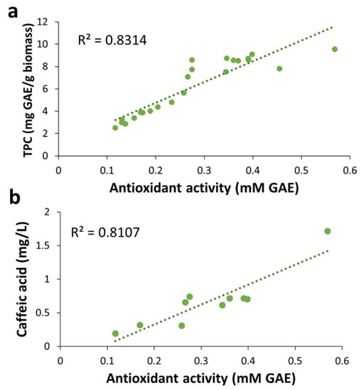 Scatter plots of the antioxidant activity in extracts from BPKO SMS versus concentrations of total phenolics (a) and caffeic acid (b). Samples are from different extraction methods.