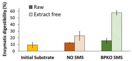 The enzymatic saccharification was also assayed for the SMS after exhaustive extraction. For both SMSs, the enzymatic digestibility of cellulose was improved after the removal of the extractive compounds (Figure 10). For the NO SMS, the enzymatic digestibility increased approximately two-fold (from 12.5 to 23.0%), while for the BPKO SMS, an almost four-fold increase was observed (from 15.8 to 57.6%). The enhancement of the enzymatic digestibility after extraction can be attributed to the partial removal of extractive compounds that are inhibitory to the enzymes. It is known that certain phenolic compounds formed by lignin degradation or by solubilization of the extractive fraction of lignocellulose inhibit cellulolytic enzymes [43]. An investigation of the effect of SMS phenolic compounds on the inhibition of enzymatic saccharification is underway by this group.