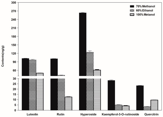 Effects of different extraction solvents on compound (luteolin, rutin, hyperoside, kaempferol-3-O-rutinoside, and quercitrin) content (ng/g).