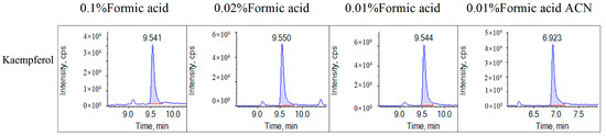 Optimizing the mobile phase was conducted to achieve the best separation and a good chromatographic shape. Adding appropriate amounts of formic acid and ammonium formate to the mobile phase can impact the responses and peak shapes of the selected analytes, as noted by Zhao et al. [26]. To determine the optimal conditions for our experiment, we compared the impact of 0.1%, 0.02%, and 0.01% formic acid in aqueous solutions on kaempferol’s peak height and shape. Our results revealed that the 0.01% formic acid aqueous solution produced kaempferol’s best peak height and shape (Figure 2).
