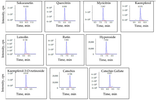 The extracted ion chromatogram (XIC) of the 10 flavonoid standards (sakuranetin, quercitrin, myricitrin, kaempferol, luteolin, rutin, hyperoside, kaempferol-3-O-rutinoside, catechin, and catechin gallate); the working concentration of each compound was 100 μg/L.